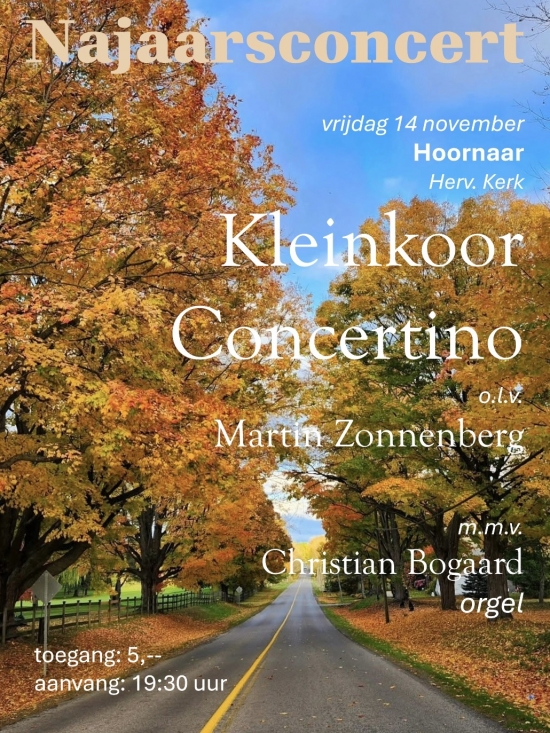 Op vrijdag 14 november wordt in de Hervormde kerk van Hoornaar een najaarsconcert gegeven met koor en orgel. Het concert is georganiseerd door Kleinkoor Concertino, dit koor staat o.l.v. Martin Zonnenberg en bestaat uit 30 zangers. Het repertoire is zeer afwisselend en voor elk wat wils, voor jong en oud. Christiaan Boogaard zal het orgel bespelen.